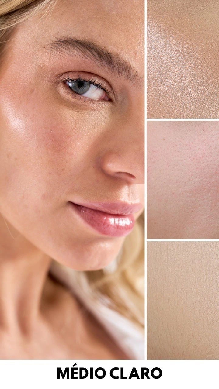 Ele oferece Fator de Proteção Solar 80, Vitamina C, Ácido Hialurônico e Vitamina E, com sua cor em tonalidade média cobre tipo efeito base.